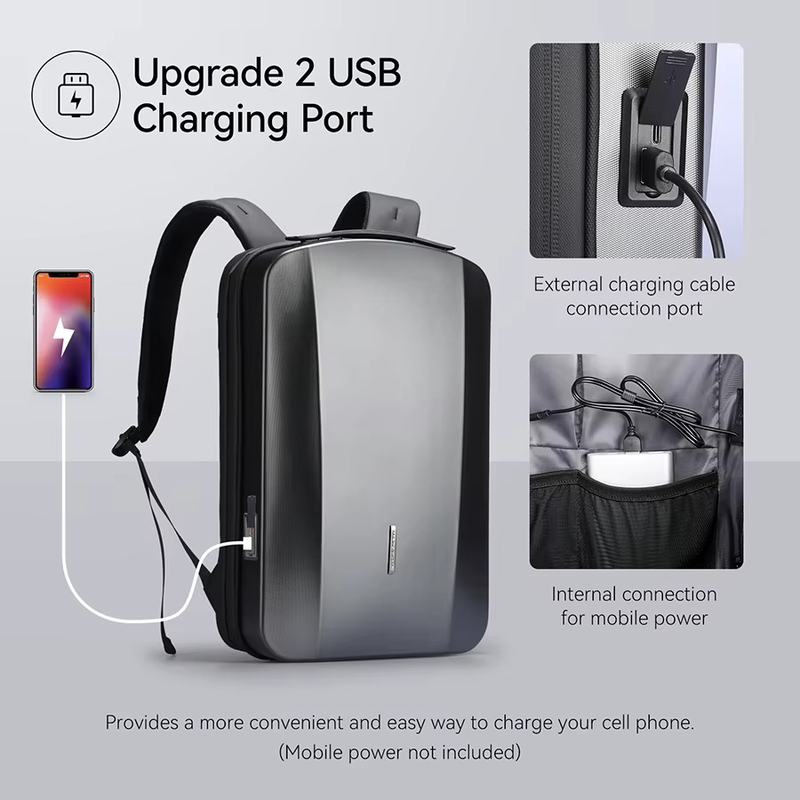 تحتوي الحقيبة على منفذ شحن USB مدمج يتيح شحن الهاتف الذكي أو الجهاز اللوحي أو أي جهاز آخر بسهولة أثناء التنقل عند توصيل باور بنك داخلي (غير مشمول).